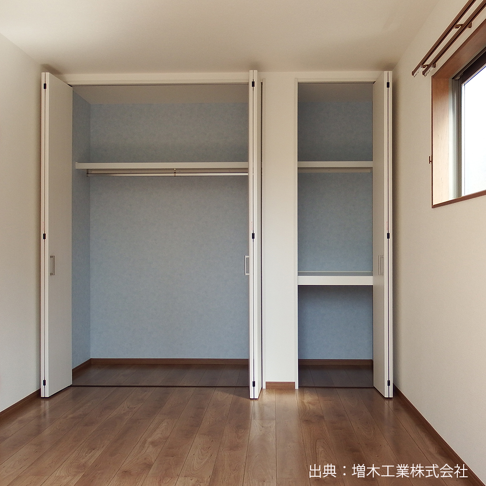 クローゼットの奥の壁に色をつけるだけで印象がかわりますね。